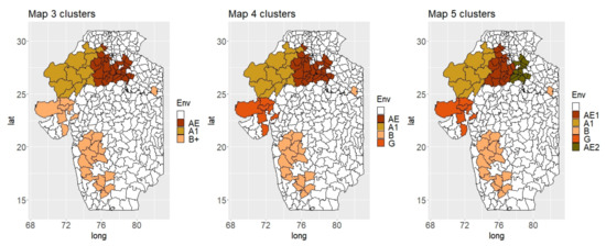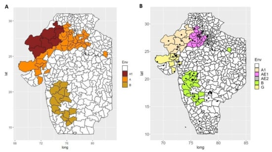 The new TPE characterization showed similarities with the current system for the A1 (North Rajasthan) and B zones that roughly remained the same (Figure 1 and Figure 3). However, the previously defined A zone showed potentially more diversity and can be re-defined into two or three distinct parts (G, AE [AE1, AE2]). Within these, the districts of Gujarat (G) shared more similarities with the B zone and could be seen as a unique entity. Similarly, the eastern part of the original A zone (AE) could be further split into two parts (AE1, AE2).