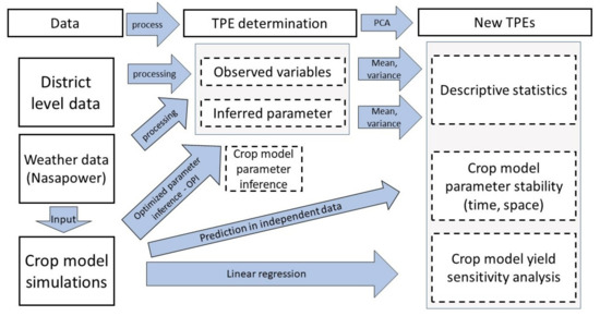 Figure 2 is a visualization of the material and methods workflow. The materials and methods is divided in three parts. The first one describes the data used for the TPE determination, (a) ICRISAT district level data (DLD); (b) Nasapower synthetic weather data [30]; and (c) parameters derived from crop model simulations (Table 1). The second part describes the methodology to determine the TPE; and the third part the crop modelling strategy to (a) infer parameters of the system using large-scale simulation, (b) use those simulations to evaluate the crop model prediction (st)ability within the identified TPEs, and (c) determine the relative influence on yield of the tested parameter in the new TPEs.