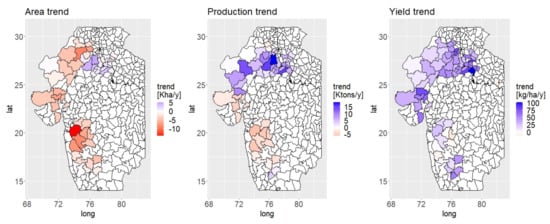 For weather, we used the synthetic data provided by Nasapower [30], which has been shown to sufficiently represent the observed weather data [24,32]. The selected data contained daily precipitation (Figure S1), minimum and maximum temperature (Figure S2), and solar radiation, which are the only requested crop model input variables. We used the R package apsimx [33] to extract the data for a point located at the center of each district. We calculated the cumulative rain during kharif season (15 June–15 September), as well as its trend and variance over years (Table 1). We also calculated the temperature trends. The rain and temperature trends were calculated as the linear regression coefficient over years.