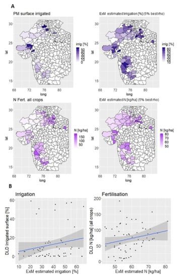 (A) Comparison of the estimated ExM parameters values for irrigation and fertilization with the average percentage of pearl millet surface under irrigation and the average amount of N fertilization for all crops during kharif according to the DLD (1998–2017) (B) Scatter plots of the estimated ExM parameters and observed district values for irrigation and fertilization.