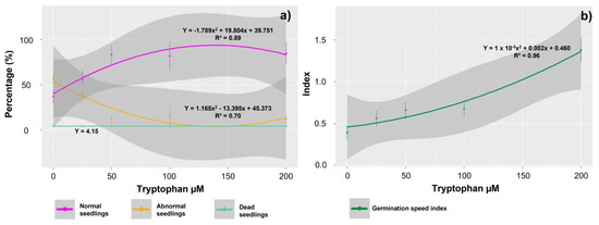 Germination percentage (%) of Glycine max L. seedlings, determined by the percentage of normal, abnormal, and dead seedlings (a) and Germination speed index (b). Data obtained from seeds treated with different concentrations of tryptophan (0, 25, 50, 100, and 200 µM).