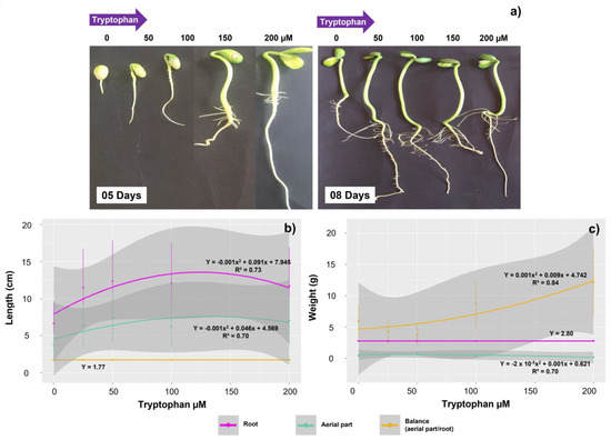 Growth of Glycine max L. seedlings obtained from seeds treated with different concentrations of tryptophan at 5 and 8 days after sowing (a), length (b), and fresh biomass (c) of the root, aerial part, and shoot/root ratio of the seedlings. Data obtained from seeds treated with the concentrations (0, 25, 50, 100, and 200 µM) of tryptophan.