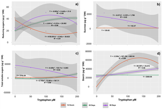 Sucrose tissue contents were affected by tryptophan concentrations only in the seedlings evaluated at 8 DAS (Figure 3b). These contents tended to decrease with increasing exposure concentrations, with the lowest average values observed in seedlings treated with 200 µM tryptophan (145.17 µg g−1 DW). Similarly, TSS contents tended to reduce with increasing tryptophan concentrations at 8 DAS, with the lowest content observed at 200 µM tryptophan (3772.77 µg g−1 DW) (Figure 3c). However, in this evaluation period, starch content tended to increase linearly with increasing exposure concentrations, with the highest contents observed in seedlings receiving the highest tryptophan concentration evaluated (41,357.84 µg g−1 DW) (Figure 3d). In the seedlings evaluated at 14 HAS, starch contents also tended to increase with increasing concentrations of tryptophan, with the highest averages observed in seedlings treated with 100 µM (57,637.73 µg g−1 DW).