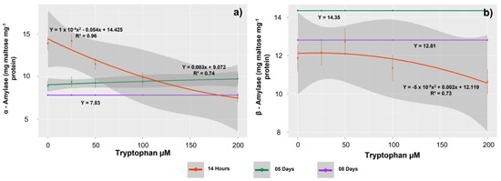 Tryptophan concentrations affected the activity of α-amylase enzymes in seedlings evaluated at 14 HAS and 5 DAS. In contrast, β-amylase activity was affected only in seedlings evaluated at 14 HAS. The decrease in activity of starch metabolism enzymes in relation to the increase in tryptophan concentrations at 14 HAS was consistent with the observed increase in starch content in the seedling tissues. Thus, the lowest activities for these enzymes were observed in the seedlings treated with 200 µM (7.52 and 10.68 mg maltose mg−1 protein for α-amylase and β-amylase, respectively) (Figure 4a,b). At 5 DAS, there was a tendency for α-amylase activity to increase in relation to increasing tryptophan concentrations. This observation explains the observed increase in tissue TSS content. Thus, the highest activity for this enzyme was observed in the treatments with 200 µM (9.74 mg maltose mg−1 protein).