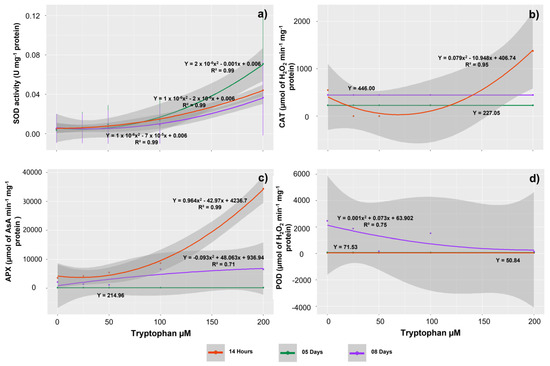 APX activity increased by increasing tryptophan concentration in the seedlings evaluated at 8 DAS, with the highest activities observed at 100 µM (6587.99 µmol AsA min−1 mg−1 protein). When the POD enzyme activity was evaluated, also there was an effect of tryptophan concentrations in the seedlings evaluated at 8 DAS. However, the behavior of this enzyme was in contrast with that observed for SOD and APX, as a decrease in activity was found in response to the increase in amino acid concentrations. Thus, the highest POD activity was observed in control seedlings (2457.53 µmol of H2O2 min−1 mg−1 protein) and the lowest activity in seedlings treated with 200 µM (138.01 µmol of H2O2 min−1 mg−1 protein) (Figure 5d).