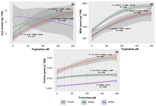 Proline values tended to increase with increasing tryptophan concentrations. Thus, the highest contents were observed in seedlings treated with 200 µM, regardless of the evaluation period (0.024, 0.011, and 0.008 µmol g−1 DW for 14 HAS, 5 DAS, and 8 DAS, respectively) (Figure 6c).