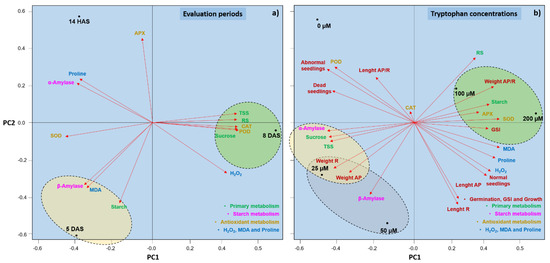 Principal component analysis of the variables of germination, GSI, growth, primary metabolism molecules, starch metabolism enzymes, antioxidant metabolism enzymes, H2O2, MDA, and proline in Glycine max L. seedlings evaluated at three developmental periods (14 h after sowing (HAS), and 5 and 8 days after sowing (DAS) (a) and treated with different concentrations of tryptophan (0, 25, 50, 100, and 200 µM) (b). S = Shoot, R = Root, GSI = germination speed index, RS = reducing sugars, TSS = total soluble sugars, MDA = malondialdehyde.