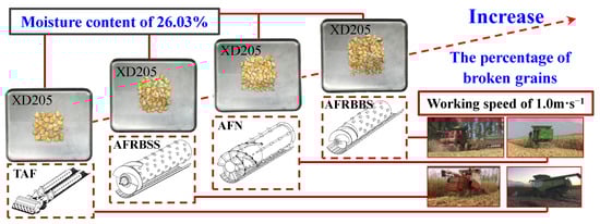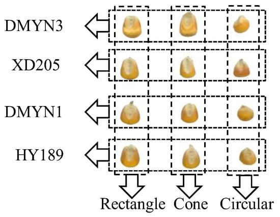 The effect of the different-variety maize with a moisture content of 26.03% on the POGB was investigated based on the AFN. The schematic presentation of grains broken using the nail-tooth threshing device for the different-variety maize harvested at a working speed of 1.0 m·s−1 is shown in Figure 4.