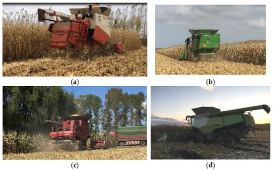 LovolGK100 (a), John DeereS660 (b), Case7088 (c), and Claas770 (d) at work.