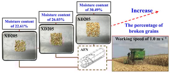 Maize is one of the most important crops in the world []. It has become a basic material widely used in food, chemistry and forage. The comprehensive value of maize will continue to increase in the future [,,]. The market competitiveness of maize can be improved by increasing the mechanized level of harvesting [,]. The efficiency of harvesting maize has been gradually improved with the continuous development of harvesting technology []. The percentage of grains broken (POGB) is a very important index in maize harvesting. It has been a focus of high-efficiency mechanized harvesting []. Moreover, a high POGB exists in the mechanized harvesting of maize grains. This problem not only reduces the grades of maize and its economic value, but also increases the cost of drying maize grains and poses serious challenges for safe storage [].