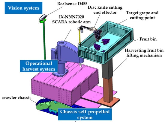 - Firstly, the regularity of fruit distribution, the structure of the robot body, and working parameters are determined using the trellis grape viticulture environment and the purpose of high-speed cutting and catching. The structure of the robot body is formed by mutual cooperation between the maximum working area of SCARA, the installation position and size of the fruit bin, and the features and working methods of the disc knife, which all help to clarify the relationship between Realsense D455 and the end effector.