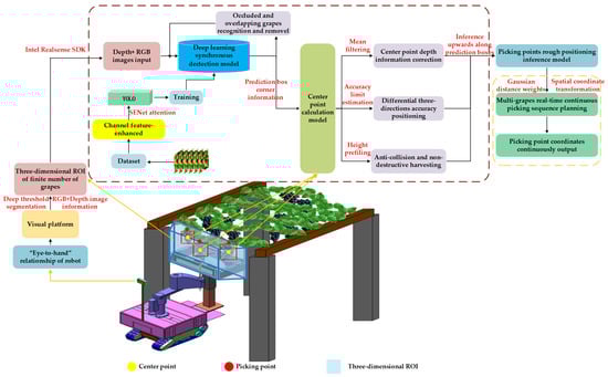 The grape picking point detection algorithms currently being researched utilize the method of accurately identifying fruit stems to achieve the precise positioning of the picking point. However, this approach suffers from the issue of time-consuming visual positioning, heavily relying on its accuracy. Moreover, the complex trellis environment introduces numerous interference factors that hinder the recognition of grape stems. Firstly, thinner fruit stems located behind branches and leaves cannot be detected due to occlusion. Secondly, the similarity in color between grape stems and grape vines makes it difficult to extract them from complex backgrounds. Furthermore, it is necessary to accurately detect the grape stem from a wide field of view through the method of close-range recognition to precisely clip the fruit stem with the end effector. Close-range recognition can be achieved by placing the camera close enough to the grapes, but this approach reduces the camera’s field of view and makes global continuous picking sequence planning impossible. Therefore, in this study a specific visual algorithm was proposed for high-speed robotic cut-and-catch harvesting, which eliminates the need to directly locate the picking point of the grape stem. This vision algorithm is based on the improved YOLO v4-SE model, enabling the inference of picking points and avoiding interference from the complex background of a trellis environment in fruit stem recognition.