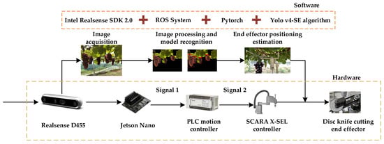 As shown in Figure 4, the software and hardware composition of this robot includes using Intel Realsense SDK 2.0 to call Realsense D455, using ROS to deploy each functional module in Jetson Nano, and using Pytorch and YOLO v4-SE to realize the grape detection and picking point positioning. By using the trellis grape information collected using the Intel Realsense D455 camera as a feedback signal, the signal is input into a Jetson Nano board for image processing and model recognition, relying on setting distance thresholds to process the three-dimensional coordinate information of a limited number of mature grapes picking points within the obtained area. The SCARA X-SEL controller is utilized to perceive the relative position information between the current position of the robotic arm and the target ripe grapes and finally to guide the disc cutter to reach the specified position area. By comparing the real-world target grape pose information with the expected pose information given by using the deep learning model, the processed control signals Signal 1 and Signal 2 are used to drive the robotic arm and the cutting end effector, realize the positioning and cutting of the target grape using the robot, and establish closed-loop control of the system.