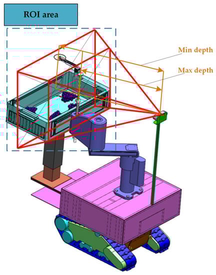 The length of the large arm of the SCARA robotic arm is 350 mm, and the farthest extension distance of the robotic arm is 700 mm. In order to prevent the large arm of the robotic arm from being over-folded and affecting work efficiency, the optimal working range of the robotic arm is 150 mm–700 mm. The fruit bin is installed at the midpoint of the front end of the harvest robot, and the distance from the base of the SCARA robotic arm is 400 mm. In order to prevent the collision between the robotic arm and the fruit bin and ensure that the target grapes are caught within the fruit bin smoothly, the distance from Realsense D455 to the inside of the fruit bin is set as the minimum depth, and the distance from Realsense D455 to the center of the fruit bin is the maximum depth. According to the minimum depth and maximum depth, this paper divides an ROI area for limited bunches of harvest grapes, as shown in Figure 7.