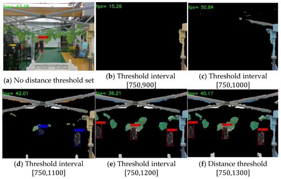 According to the relevant parameters of the high-speed operation area, the distance threshold interval of [750, 1200] is applied to the trellis environment where the robot practically works, as shown in Figure 9. The recognition effect before and after threshold segmentation in the actual harvesting process of the trellis vineyard environment is compared. It is found that at the optimal depth threshold interval, not only is the interference from the complex foliage foreground and irrelevant background in the field of view of the camera eliminated, but the recognition effect of the model is also good at this time. The detection of all target grapes that meet the harvest requirements in the field of view is realized.