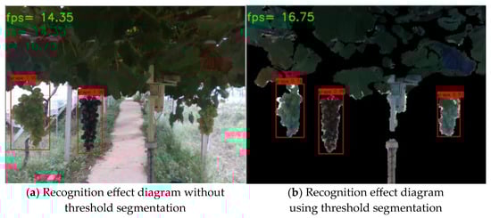 According to the relevant parameters of the high-speed operation area, the distance threshold interval of is applied to the trellis environment where the robot practically works, as shown in Figure 9. The recognition effect before and after threshold segmentation in the actual harvesting process of the trellis vineyard environment is compared. It is found that at the optimal depth threshold interval, not only is the interference from the complex foliage foreground and irrelevant background in the field of view of the camera eliminated, but the recognition effect of the model is also good at this time. The detection of all target grapes that meet the harvest requirements in the field of view is realized.