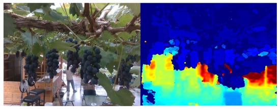 The trellis grape images used for training and testing in this experiment were collected at Erya Vineyard, Jurong Grape Technology Comprehensive Demonstration Base, Jurong City, Jiangsu Province. The image acquisition device is an Intel Realsense D455 camera. An RGB image and corresponding depth image are captured using Intel Realsense SDK 2.0 simultaneously, as shown in Figure 10, which will be aligned for further deep learning detection.