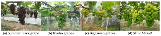 There are 200 images of each variety of trellis grape with different colors, with a total of 800 images, as shown in Figure 11. The collection time focuses only on the period between July and September 2021. The camera is installed at a height of 185 cm from the ground, and the view distance ranges from 30 cm to 150 cm.