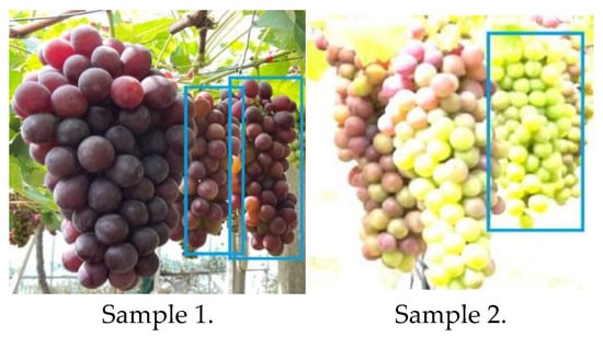 Due to the complexity of the actual harvesting trellis environment, the samples of fruit overlapping, fruit occluded, and strong light-affected color changes in the captured images are added, which are indicated by blue boxes, as shown in Figure 12.
