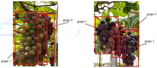 The labeling method of the trellis grape depth image is the same as that of the RGB image, and the grape labeling in the image should be as consistent as possible. The labeling method for overlapping and occluded grapes is shown in Figure 13. The overlapping and occluded grapes are marked as grape 2 and grape 3, respectively, and input into the deep learning model for training, so that they can be distinguished in the recognition and positioning process of subsequent harvesting.
