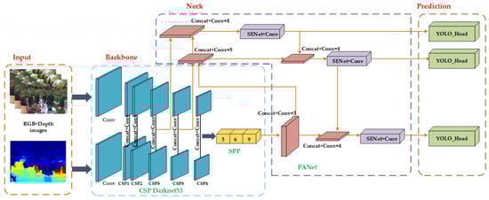 The YOLO v4-SE model, an improvement over YOLO v4, incorporates the SENet attention mechanism after the feature fusion layer, as illustrated in Figure 15. The YOLO v4-SE model automatically calculates the importance of each feature map based on the correlation among the feature maps extracted from the input trellis grape image. The calculated importance values are then utilized to enhance the discriminative features of the trellis grapes themselves during the YOLO v4-SE detection process. Additionally, they help suppress interference caused by complex environmental factors, improving the accuracy of detection, which can realize efficient detection in the three-dimensional ROI.