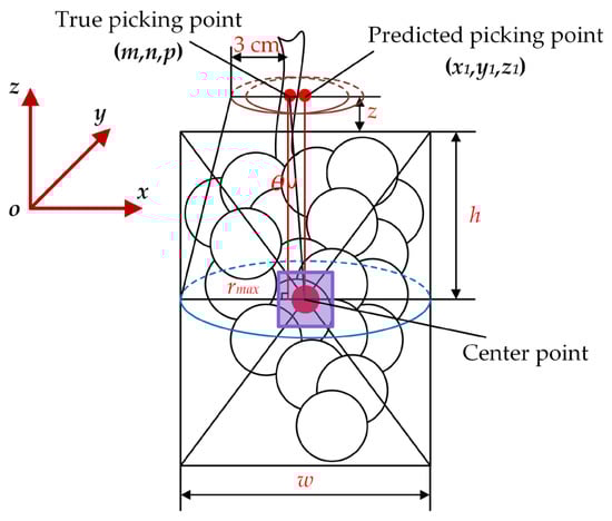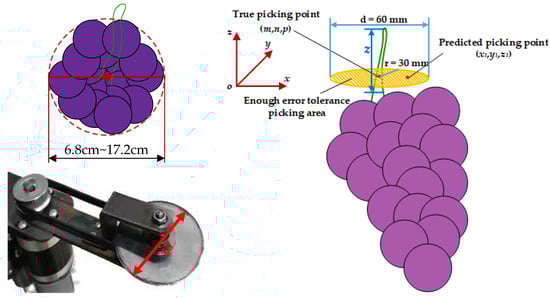 This paper presents a three-dimensional positioning method that incorporates differential rough positioning accuracy to optimize efficiency. It was found during field research that the diameter of the circumscribed circle at the widest point of mature grapes ranges from 6.8 cm to 17.2 cm. Therefore, the cutting end effector used by the harvesting robot proposed in this paper is a disc knife with a diameter of 60 mm. The cutting speed of the disc knife is fast. At the same time, it has enough error tolerance for the positioning of the trellis grape picking points during the picking process. Figure 16 illustrates the coordinates of the true picking point (m, n, p) and the predicted picking point (x1, y1, z1). A circular plane picking area with a radius of 30 mm is formed using the working diameter of the disc knife cutting end effector to allow enough error tolerance, which is centered on the x and y coordinates of the true picking point.