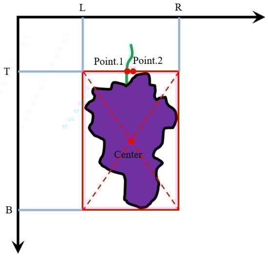 At the same time, this paper uses a calculation in three directions to improve the accuracy of the inference of the grape picking points upwards along the prediction boxes. As shown in Figure 19, the prediction box can be used as the minimum bounding rectangle of the target grape. Since the grape itself is center-symmetrically distributed along the fruit stem, half the width of the prediction box is used as the radius, and the center point is moved by a radius distance along the y direction and taken as the center of the circle, which is then used to draw a blue circle in the figure.