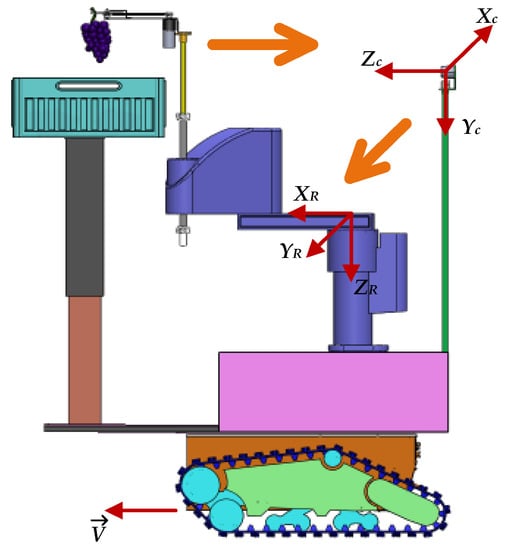 Grapes are one of the most important fruits in the world [], and China is the main producer of grapes. Due to the intensification of grape industrialization and the increase in demand, it has become a realistic remand to realize the automation of harvesting []. Various prototypes of grape harvesting robots have been developed in China, Greece, Canada, and other countries, which all adopt classic hand–eye calibration [,,]. They all pick grapes by stem clipping and cutting, heavily relying on visual positioning accuracy, and then place the grapes into bins. Inadequate efficiency has become the key bottleneck standing in the way of meeting the actual needs of grape production. Significantly improving work efficiency has become an urgent task in technical development. Inspired by the high-efficiency mechanized harvesting of grain and leaf vegetables, a vision-based high-speed cutting-and-catching harvesting robot is proposed by our team, which transforms the traditional precise positioning and picking method into a continuous harvesting-by-vision method. It provides new possibilities to break through the efficiency ceiling of robotic harvesting. Different from the working process of combine harvesters, vision is still necessary for fresh grape harvesting. Nevertheless, the need of vision technology for this cut-and-catch scheme is greatly different from traditional harvesting robots.