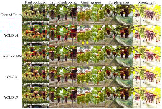 As shown in Figure 21, the red rectangular box is the prediction result, the red arrow indicates the missed detection of the target, and the yellow arrow indicates the false detection of the target. It can be seen from Figure 21 that the improved YOLO v4-SE model proposed in this paper has good detection performance for samples with occluded grapes, overlapping grapes, green grapes, purple grapes, and grapes affected by strong light, and the improved model can mostly identify the target trellis grapes that are missed or occluded in the image. At the same time, it also can be applied to the detection of grapes of different colors and the working environment affected by strong light, which is ideal for robotic harvest. Although the improved YOLO v4-SE also has missed detection under strong light conditions, the grapes eligible for robot harvesting are all correctly identified. Therefore, YOLO v4-SE with high recognition accuracy is suitable for the complex trellis grape cultivation environment and trellis grape harvesting.