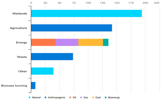 Global methane emissions are increasing, especially from anthropogenic sources in the agricultural sector, and waste and biomass industries. Around 60% of emissions originate from anthropogenic sources such as landfills, biomass, rice agriculture, and fossil fuel use, and around 40% originate from natural sources [3]. Anthropogenic methane emissions by sector, as reported to the UN Framework Convention on Climate Change (UNFCCC), show that anthropogenic emissions from the agriculture sector are the highest (Figure 1) [6]. The Global Methane Assessment reports that the agricultural sector constitutes about 40% of global anthropogenic emissions of methane, with rice cultivation accounting for 8% [7].