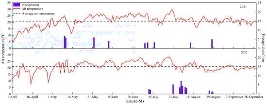 Figure 1. Daily air temperature and precipitation during the cotton growing seasons in 2021 and 2022.