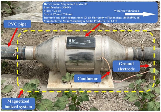The canal water originated from meltwater in the Tianshan Mountains. After being filtered and pressurized in the pump room, it entered the field through buried pipelines. The outlet of the buried pipeline in the field was a 90 mm PVC pipe. A magnetized ionized device was connected to the 90 mm water pipeline. The magnetized ionized system (Xi’an Wangkaiyue Metal Products Co., LTD) consisted of a magnetized ionized device, ground electrode and conductor (Figure 2). The magnetizer uses a permanent magnet ring with a magnetic field intensity of 3000 Gs. The grounding resistance of the experimental device was 5 Ω and the ground bolt was connected to the ground electrode via a wire. Under the action of the magnetic field, the average distance between water molecules increases, and some hydrogen bonds weaken or even break. With the application of the ionized technology, as water passes through the system, it is enriched with electrons, and these electrons are then channeled underground through grounded wires [40,41].