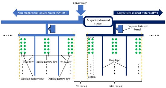 In order to improve the leaching of salts and increase soil water content, activated water technology for agricultural irrigation, including magnetized ionized water (MIW), has attracted an increasing amount of attention as it is an environmentally friendly and highly efficient technique [9,10]. In particular, under MIW, the magnetic field increases the average distance between water molecules and weakens (or even breaks) some hydrogen bonds, which reduces the size of the large associated water molecular clusters [11,12]; after the treatment of irrigation water by ionized technology, the salt ions in the water remain positively charged. The positive ions repel each other, preventing the binding of the water and salts [13]. Magnetized technology and ionized technology for irrigation reduce the surface tension and viscosity coefficients of water and increase the diffusion coefficient, thus effectively enhancing the diffusion ability and permeability of water and leaching of salts in saline soil areas [14,15,16,17,18,19]. Moreover, magnetized treatment or ionized treatment is also beneficial for the planting, physiology and yield of crops in saline soil [20]. Meysam et al. [21] reported that the growth parameters (i.e., germination rate, seedling height and weight, etc.) of maize and soil salinity leaching improved under magnetic water treatment compared with no treatment. Alkassab et al. [22] also found that magnetized water irrigation was associated with a statistically significant increase in plant height and leaf area. Wei et al. [13] reported improvements in plant height, leaf area index and shoot dry matter resulting from the ionized treatment. Numerous scholars have also demonstrated that the application of magnetized treatment or ionized treatment for irrigation can enhance crop yield and WUE [13,23,24,25]. Water serves as the medium, solvent, or catalyst facilitating the transportation of various substances within soil [20]. Under MIW, the physicochemical properties of irrigation water undergo a transformation, leading to increased efficiency of soil substance transportation, such as soil water diffusion ability and leaching of salts, which has positive effects on the growth characteristics of crop. Such enhancements establish the groundwork for the effective remediation of saline soil with other improvement measures.