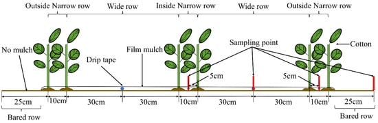 Soil samples were collected to determine soil water content and salinity at 10 cm intervals from 0 to 40 cm and at 20 cm intervals from 40 to 100 cm using an auger with a 5 cm diameter in the middle of the wide, narrow, and bared strips (Figure 4). The samples were collected at the late main growth stages for cotton one day prior to irrigation and harvest. All the auger holes were refilled with soil to minimize the experimental error after each of the samples was collected. The soil samples were weighed, dried in a fan assisted oven at 105 °C for 24 h, and reweighed to determine the gravimetric soil water content. The volumetric soil water content was then obtained by multiplying the gravimetric soil water content by the corresponding soil bulk density. A DDSJ-308A conductivity meter (Shanghai Yidian Scientific Instrument Co., Ltd., Shanghai, China) was used to measure the electrical conductivity of a 1:5 soil water extract (EC1:5) under 25°C. The value of EC1:5 (dS m−1) for each soil sample can be converted into salts content in soil (SC, g kg−1) based on a linear relationship (SC = 0.99 × EC1:5, R2 = 0.9992, n = 30).