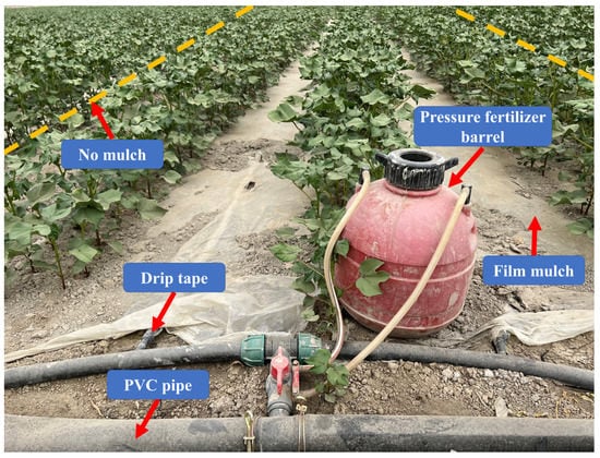 Cotton (Gossypium hirsutum L. Tahe No.2) was sown on 9 April 2021 and 10 April 2022; and harvested on 10 October 2021 and 30 September 2022. The planting density was 1.80 × 105 plants per hectare, with a plant and row spacing of 10 cm. The cotton was grown under drip irrigation with a plastic film-mulched system (Figure 4 and Figure 5). The drip system was installed with a row configuration of 10 cm + 60 cm + 10 cm + 60 cm + 10 cm (outside narrow, wide, inside narrow, wide, outside narrow). Two driplines were installed per six rows under a 1.5 m wide film. The distance between two films was 50 cm. Irrigation was performed using a 1.6 cm diameter drip line. The average emitter spacing was 30 cm, and the discharge rate for each drip emitter was 2.0 L h−1. Table 2 reports the cotton developmental stages in 2021 and 2022. Figure 6 reports the irrigation schedule of the cotton under FMDI in this study. The first irrigations during the cotton growth stage in the cotton field were performed on 12 June 2021 and 13 June 2022. The irrigation amounts recorded by a water meter were 501.60 and 518.85 mm in 2021 and 2022, respectively. Urea (N ≥ 46%) and potassium dihydrogen phosphate (KH2PO4 ≥ 99.5%) fertilizers were applied eight times during the cotton growth stage. Differential pressure fertilizer barrels with a 15 L capacity were used to apply the fertilizers. One barrel was placed in each experimental plot.