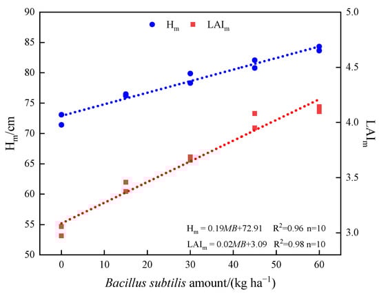 Figure 9. Relationship between the B. subtilis amount under magnetized ionized water and the theoretical maximum values of plant height (cm) and leaf area index in 2021 and 2022. Hm and LAIm are theoretical maximum values of plant height (cm) and leaf area index; MB denotes the B. subtilis amount under the MIW treatment (kg ha−1).