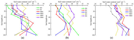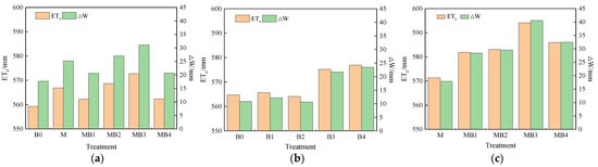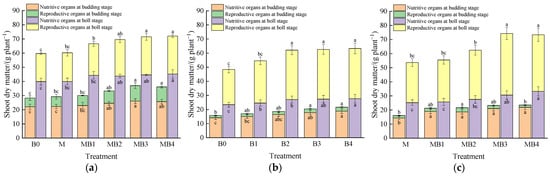 Figure 10. Effects of B. subtilis amounts and irrigation water type on the cotton shoot dry matter in 2021 and 2022. (ac) represent the cotton shoot dry matter in 2021, cotton shoot dry matter under NMIW in 2022 and cotton shoot dry matter under MIW in 2022, respectively. B0, B1, B2, B3, and B4 denote B. subtilis amounts of 0, 15, 30, 45, and 60 kg ha−1, respectively, under the NMIW treatment. M, MB1, MB2, MB3, and MB4 denote B. subtilis amounts of 0, 15, 30, 45, and 60 kg ha−1, respectively, under the MIW treatment. Data are reported as the mean the values of three replicates. Errors bars indicate standard errors. Different letters above the bars indicate significant differences among treatments at p < 0.01.