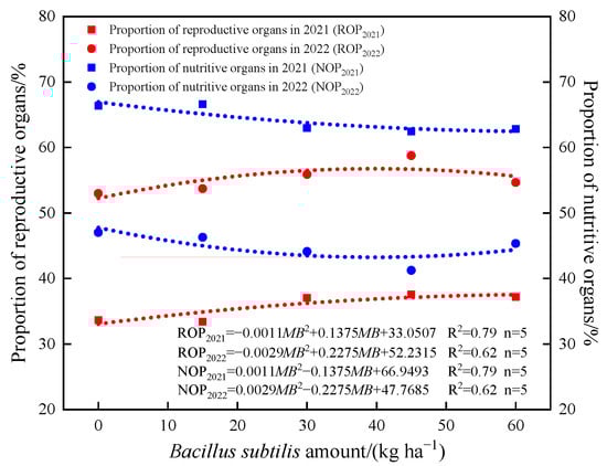 Shoot dry matter is one of the important factors affecting crop yield. The proportion of biomass allocation varied with the cotton growth stages. The distribution and transportation of nutrients were centered on the vegetative organs in the early stage and gradually transferred to the reproductive organs after the budding stage. Coordinated biomass allocation is the key to increasing seed cotton yield [52]. To explore the effects of B. subtilis amounts on the reproductive and nutritive growth of cotton, quadratic functions were employed to characterize the B. subtilis amounts and ROP (proportion of cotton reproductive organs to total shoot dry matter) at the boll stage under MIW, and the B. subtilis amounts and NOP (proportion of cotton nutritive organs to total shoot dry matter) at the boll stage under MIW (Figure 11). Compared with B0, the MIW treatments and B. subtilis amounts increased the proportion of reproductive organs at the boll stage. This aided in increasing cotton yield. By taking the first derivative of the quadratic function (Figure 11), when the B. subtilis amount reached 62.5 kg ha−1, the ROP and NOP reached maximum values of 37.3% and 62.7%, respectively, in 2021; when the B. subtilis amount reached 39.2 kg ha−1, the ROP and NOP reached maximum values of 56.7% and 43.3%, respectively, in 2022.