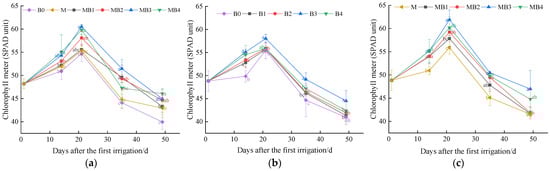 Figure 12. Effects of B. subtilis amounts and irrigation water type on the leaf SPAD values in the 2021–2022 cotton growing seasons. (ac) represent leaf SPAD values in 2021, leaf SPAD values under NMIW in 2022 and leaf SPAD values under MIW in 2022, respectively. B0, B1, B2, B3, and B4 denote B. subtilis amounts of 0, 15, 30, 45, and 60 kg ha−1, respectively, under the NMIW treatment. M, MB1, MB2, MB3, and MB4 denote B. subtilis amounts of 0, 15, 30, 45, and 60 kg ha−1, respectively, under the MIW treatment. Data denote the mean values of three replicates. Errors bars denote standard errors. Different letters above bars indicate significant differences among treatments at p < 0.01.