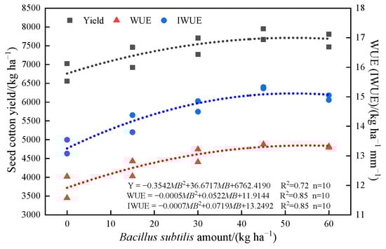 Additionally, B. subtilis can produce phytohormones, such as Indole acetic acid (IAA), to promote plant growth [73,74]. Based on a two-year field experiment, Lu et al. [75] found that applied B. subtilis can significantly improve the plant height and yield of rice (p < 0.05). Zhao et al. [76] reported that, compared with a control treatment, the treatment of B. subtilis increased seed cotton yield by 6.1%. Moreover, the application of B. subtilis resulted in the plant fresh weight, dry weight, and number of branches increasing by 28.2%, 18.6%, and 5.1%, respectively. Lyu et al. [77] demonstrated an increase in cannabis flower fresh weight by 5.1% for plants inoculated with B. subtilis. Our results indicated that moderate applications of B. subtilis promoted crop growth (height, LAI, shoot dry matter and SPAD), seed cotton yield, WUE, and IWUE. In order to quantify the change in cotton plant height and LAI with time after the first irrigation under different B. subtilis amounts, a logistic model was used to describe the growth process of cotton. Based on this, the logistic growth models of H and LAI under the MIW treatment were established. Hm and LAIm increased with the B. subtilis amounts for the range of 0–60 kg ha−1. Cotton descends from perennial ancestors, and as a result, excessive water or nutrients leads to rank growth, namely an increase in stem length, internode length, and leaf number at the expense of reproductive growth [78]. We also found that excessive amounts of B. subtilis resulted in predominantly nutritive growth and reduced seed cotton yield (Figure 9, Figure 11 and Figure 16). The application of B. subtilis played an important role in improving cotton growth, WUE, IWUE, seed cotton yield, soil water and salt conditions, and seed cotton yield. An optimal application amount of B. subtilis was proposed to account for these components.
