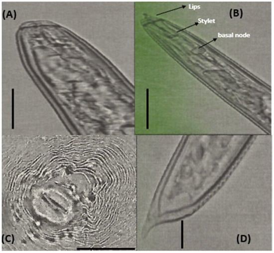 Morphological characterization of Meloidogyne exigua (A) anterior region of a male, (B) anterior region of second stage juvenile, highlighting the stylet and mouth, (C) perineal pattern of females and (D) posterior region of third instar juveniles (bar = 20 µm).