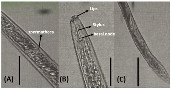 Morphological characterization of Pratylenchus coffeae: (A) spermatheca, highlighting its structure and location within the female nematode; (B) anterior region of the female, highlighting the stylet and mouth; (C) posterior region of the female tail (bar = 20 µm).