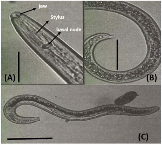 Morphological characterization of Helicotylenchus longicaudatus: (A) anterior region of a male, showing the stylet and mouth with flattened lips; (B) posterior region of the male, exhibiting the tail with anal opening and a ventral projection; (C) complete female (bar = 20 µm).