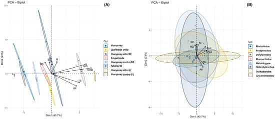 The association between the proliferation of phytoparasitic nematodes in the different zones and the relationship with the variables that were estimated according to Pearson correlation analysis with the aid of statistical software Rbio were previously determined []. Correlation networks were established to better visualize the general correlations existing between the variables evaluated, and the specific correlations associated with each of the nematode species described in the work. Principal component analyses (PCA) for the interpretation of the results were performed. These analyses were performed using Rbio software version 166 for Windows (Rbio Software version 166, UFV, Viçosa, MG, Brazil).