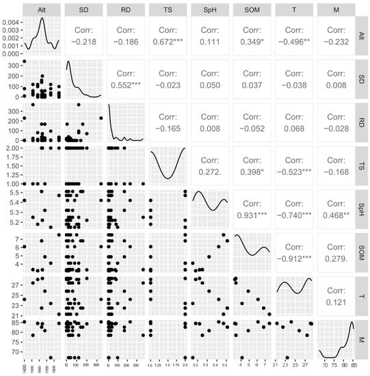 Pearson correlation and scatter plot obtained when comparing eight characteristics evaluated in coffee var. Typica: altitude above sea level (Alt), density of phytoparasitic nematodes in the soil (SD), density of phytoparasitic nematodes in the root (RD), soil texture (TS), soil pH (Sph), soil organic matter (SOM), temperature of the zone (T) and humidity of the zone (M). Correlation values with symbols *, ** and *** represent significant differences at 0.5, 0.1 and 0.01%, respectively. SD showed moderate (0.55) and highly significant (p < 0.001) correlations only with RD, evidencing that there is a high chance that whenever a density of nematodes is found in the soil, they are present in the roots as well. TS was positively correlated with SOM (0.40, p < 0.05) and was highly significant, but of negative magnitude with T (−0.52, p < 0.001). For SpH, apart from the variables that manifested high correlations (Figure 5), M also exerted an effect on this variable (0.47, p < 0.01).