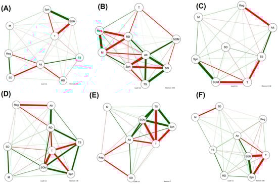 Correlation network obtained by establishing Pearson corrections: region (Reg), altitude above sea level (Alt), density of phytoparasitic nematodes in soil (SD), density of phytoparasitic nematodes in roots (RD), soil texture (TS), soil pH (Sph), soil organic matter (SOM), temperature of the area (T) and humidity of the area (M). The different networks obtained are in relation to the phytoparasitic nematodes genera and categories: (A) Meloidogyne, (B) Helicotylenchus, (C) Dorylaimidos, (D) Pratylenchus, (E) Trichodoridos and (F) Rhabditidos. The thickness of the line between thicker, closer to a correlation value of 1 or −1, depending on the color. Red and green lines represent negative and positive correlations, respectively.