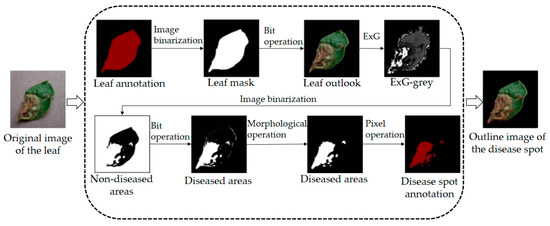 From Figure 1, it can be observed that the severity of diseases in the PLDD images varies. In the case of late blight, the leaves exhibit irregular brown-green patches on the surface during the advanced stage of the disease. In a humid environment, white mildew may appear on the leaves, while under dry conditions, the entire leaf can wither and shrink. On the other hand, in the case of early blight infection, the disease spots initially manifest as scattered brown circular patches, gradually enlarging to become nearly circular in shape. The disease spots display distinct concentric rings and may exhibit a yellow halo around the outer edge. Severe infections can lead to localized necrosis of the leaves. Due to variations in the progression of the disease across different leaves, the locations, quantities, and sizes of the disease spots are highly random. Additionally, with a dataset comprising nearly ten thousand images, manual annotation of the disease spots presents a significant challenge. Given the clear color distinction between healthy green leaf surfaces and disease spots, this study considers utilizing the ExG vegetation index and traditional image processing methods to differentiate the disease spots. The process for extraction the disease areas is illustrated in Figure 3, the specific steps are as follows.