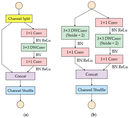 In 2018, Ma et al. [22] introduced the ShuffleNetV2 network, an improvement upon ShuffleNetV1, based on four efficient network design principles. ShuffleNetV2 incorporates a channel-splitting approach. Initially, the channel dimension of the input feature map is evenly divided into two branches. The left branch undergoes equal mapping, while the right branch undergoes successive convolutions with 1 × 1, 3 × 3 depth separable, and 1 × 1 convolutions. These operations ensure that the input and output channels remain the same. Subsequently, the outputs of the two branches are fused together using a concatenation operation, allowing for information exchange. Additionally, when the convolution step is 2, indicating spatial down sampling, the channel splitting operation is removed to double the output dimension. The fundamental unit of the ShuffleNetV2 network is depicted in Figure 4a,b.
