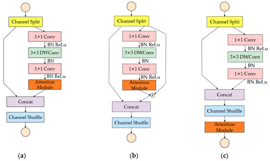 Different forms of Shuffle-Attention module structure. (a) The structure of Shuffle-Attention-A; (b) The structure of Shuffle-Attention-B; (c) The structure of Shuffle-Attention-C.