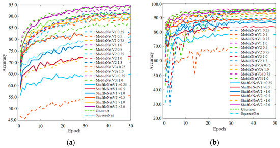 The current prevalent lightweight backbone networks include the ShuffleNet series [27], MobileNet series [28,29,30], Ghostnet [31], and SqueezeNet [32], among others. This study conducted a comparative analysis of the classification performance of these aforementioned lightweight network models on the PLDD dataset. Multiple indicators, such as classification accuracy and model complexity, were utilized to comprehensively evaluate the performance of each model. Subsequently, the network that demonstrated the best performance was selected as the fundamental model for this chapter. The accuracy change curves for the training set and validation set of each classification network are depicted in Figure 7, while the performance index results of each network on the test set are presented in Table 4.